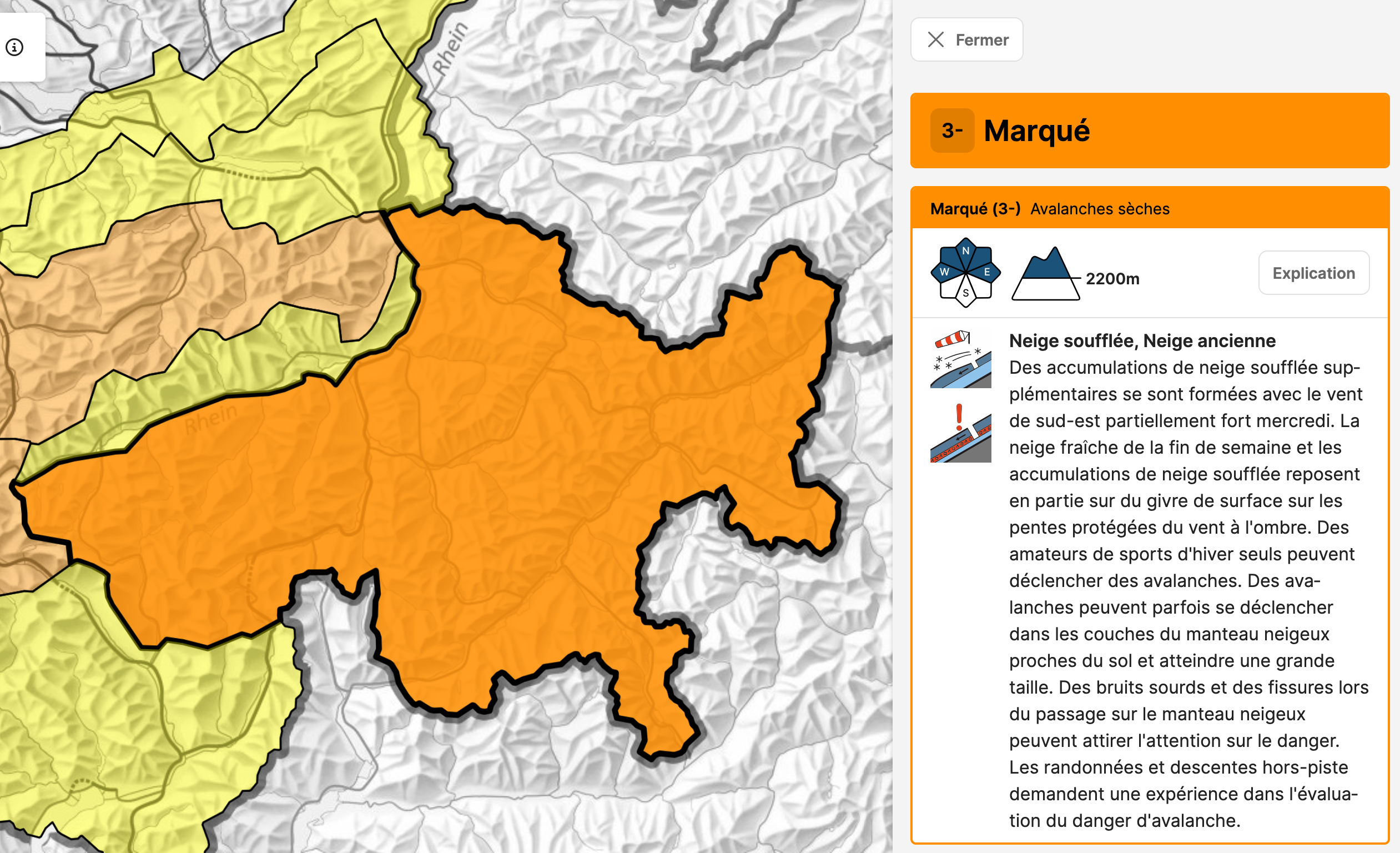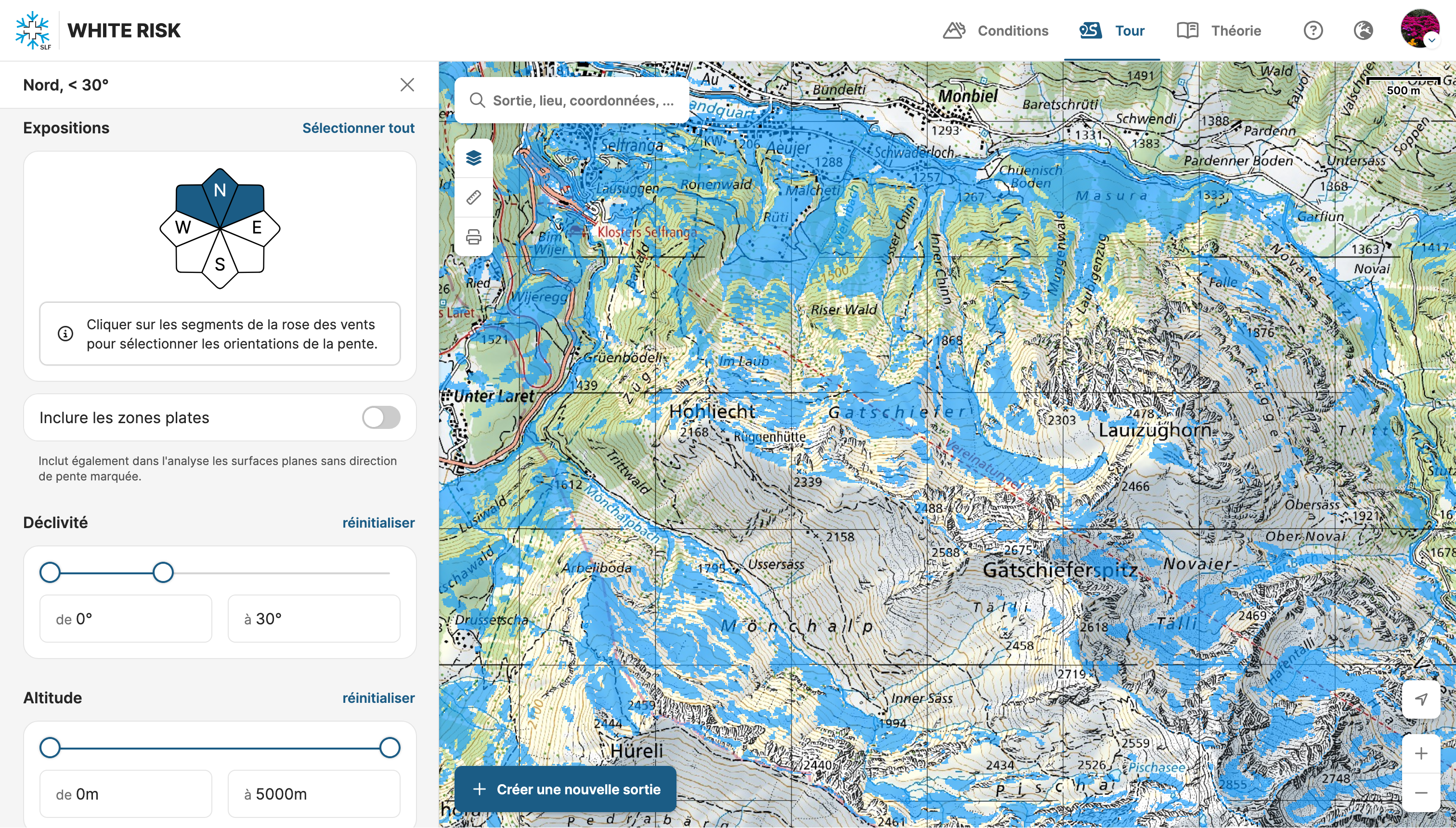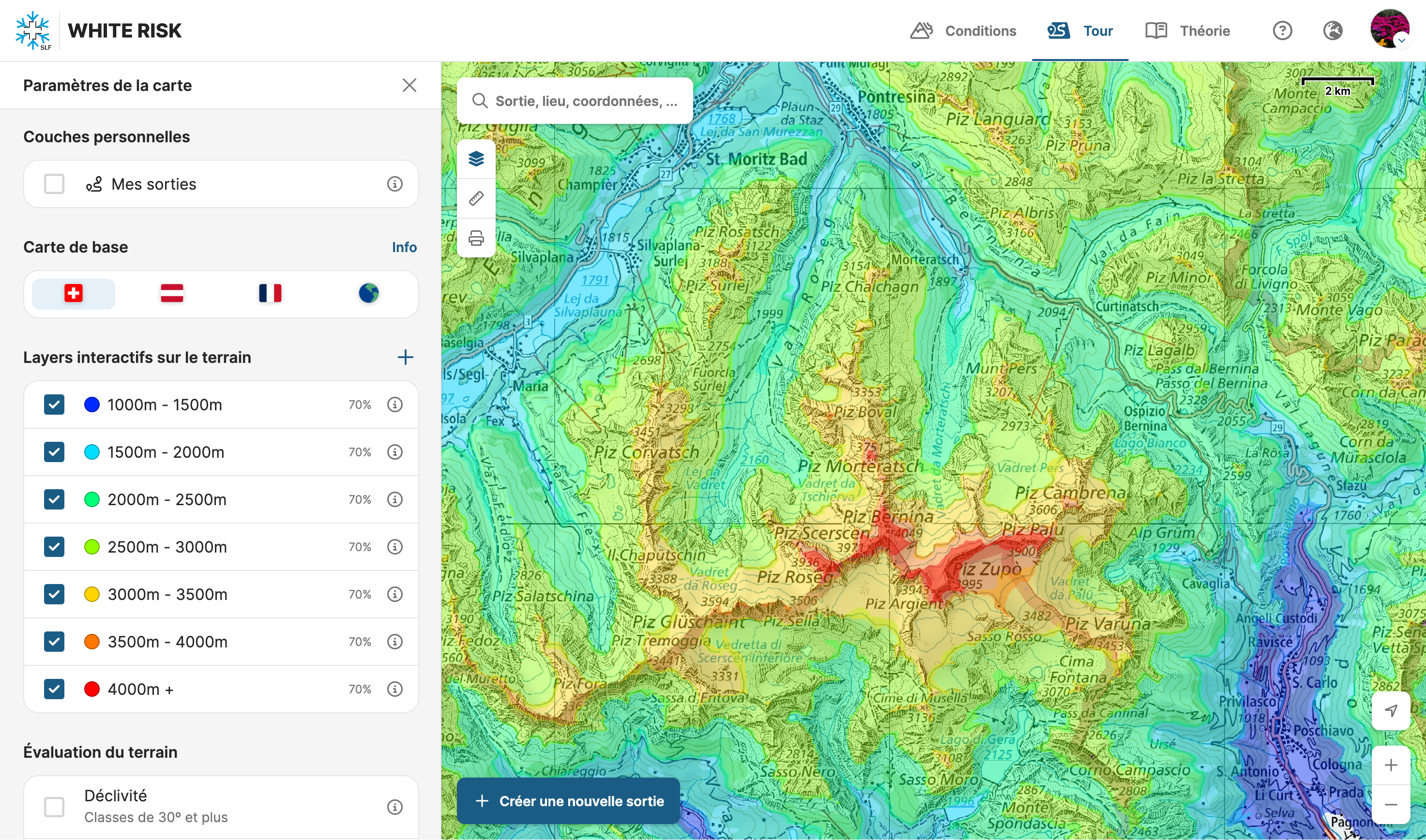 Les couches de terrain interactives te permettent de mettre en évidence des zones de terrain en fonction de caractéristiques spécifiques. Tu définis toi-même l'exposition, la pente et l'altitude qui t'intéressent. Toutes les zones répondant à ces critères sont directement mises en évidence sur la carte.