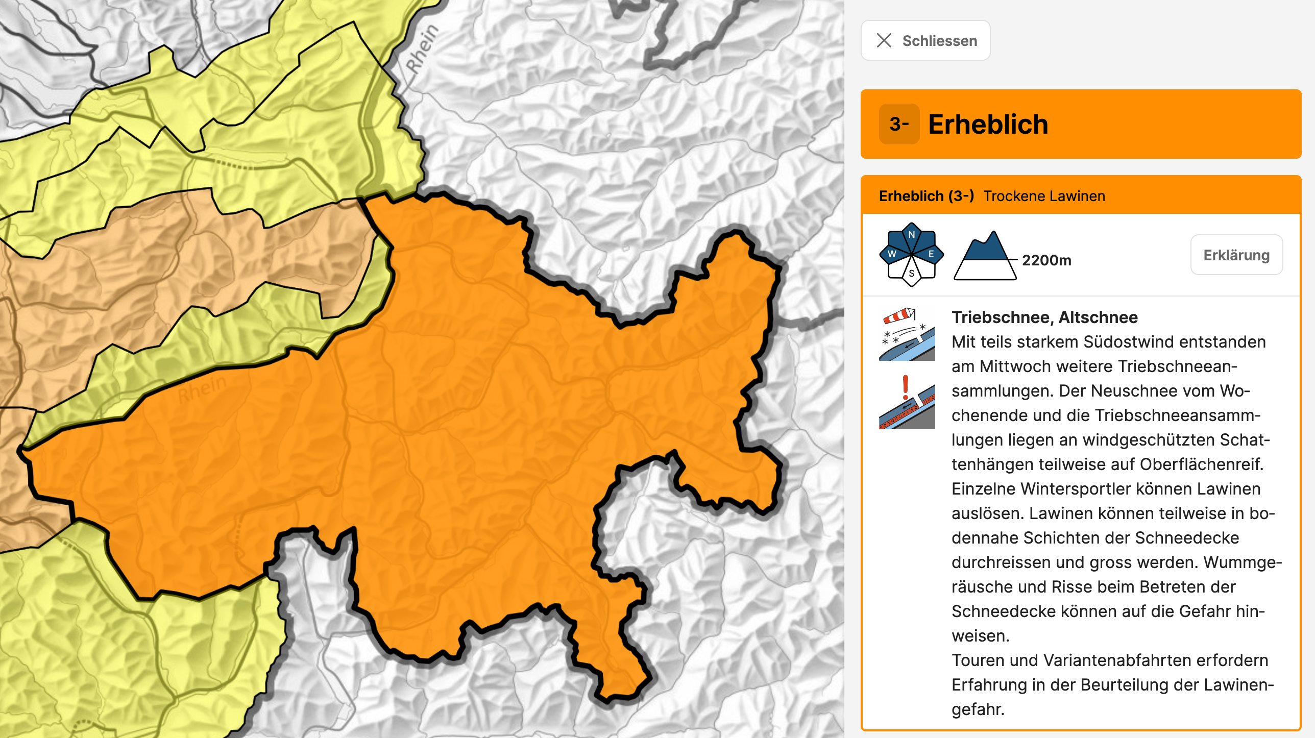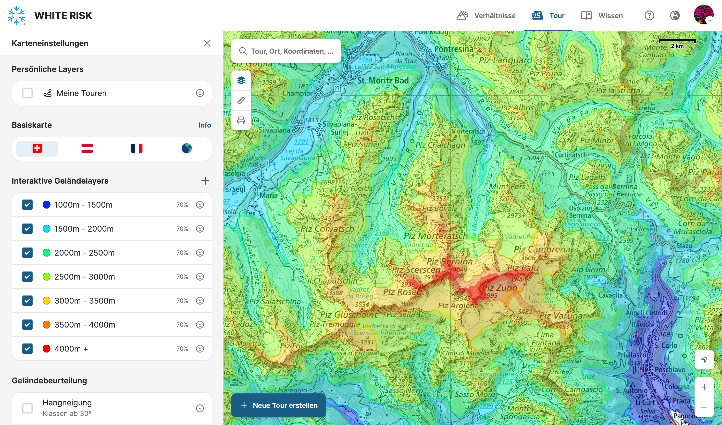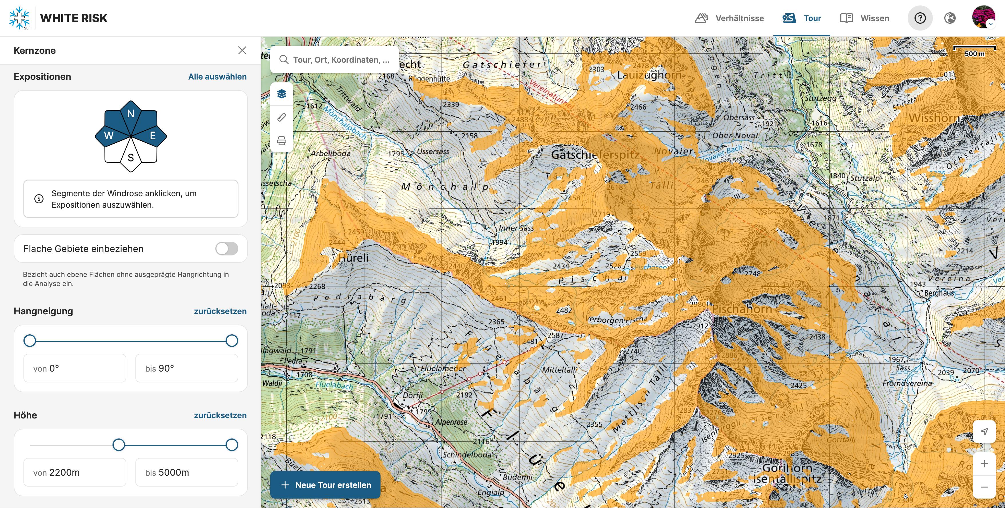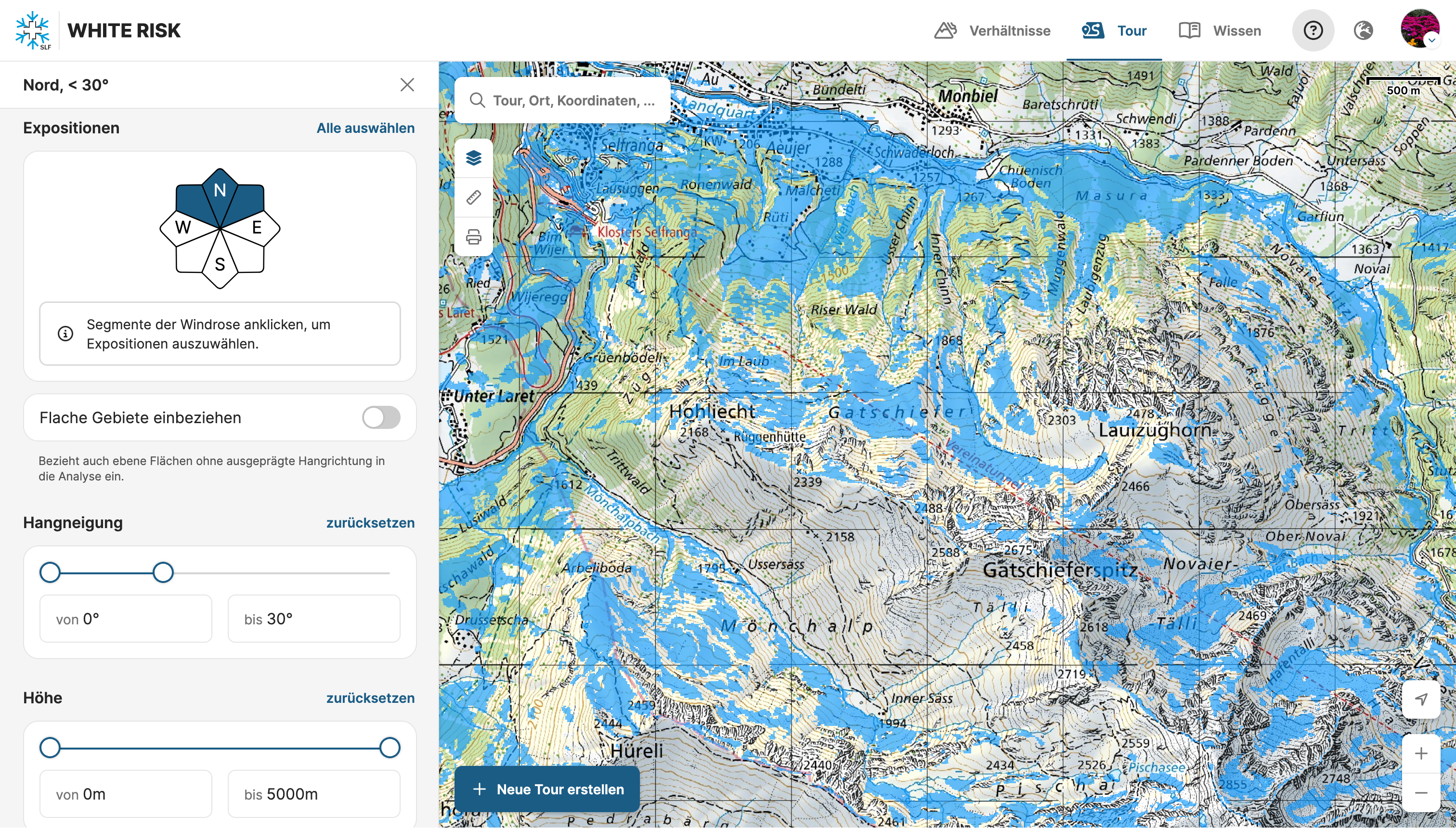 Mit den interaktiven Geländelayern kannst du Gelände gezielt nach bestimmten Eigenschaften hervorheben lassen. Du definierst selbst, welche Exposition, Hangneigung und Höhenlage für dich relevant sind. Alle Bereiche, die diesen Kriterien entsprechen, werden direkt auf der Karte markiert.