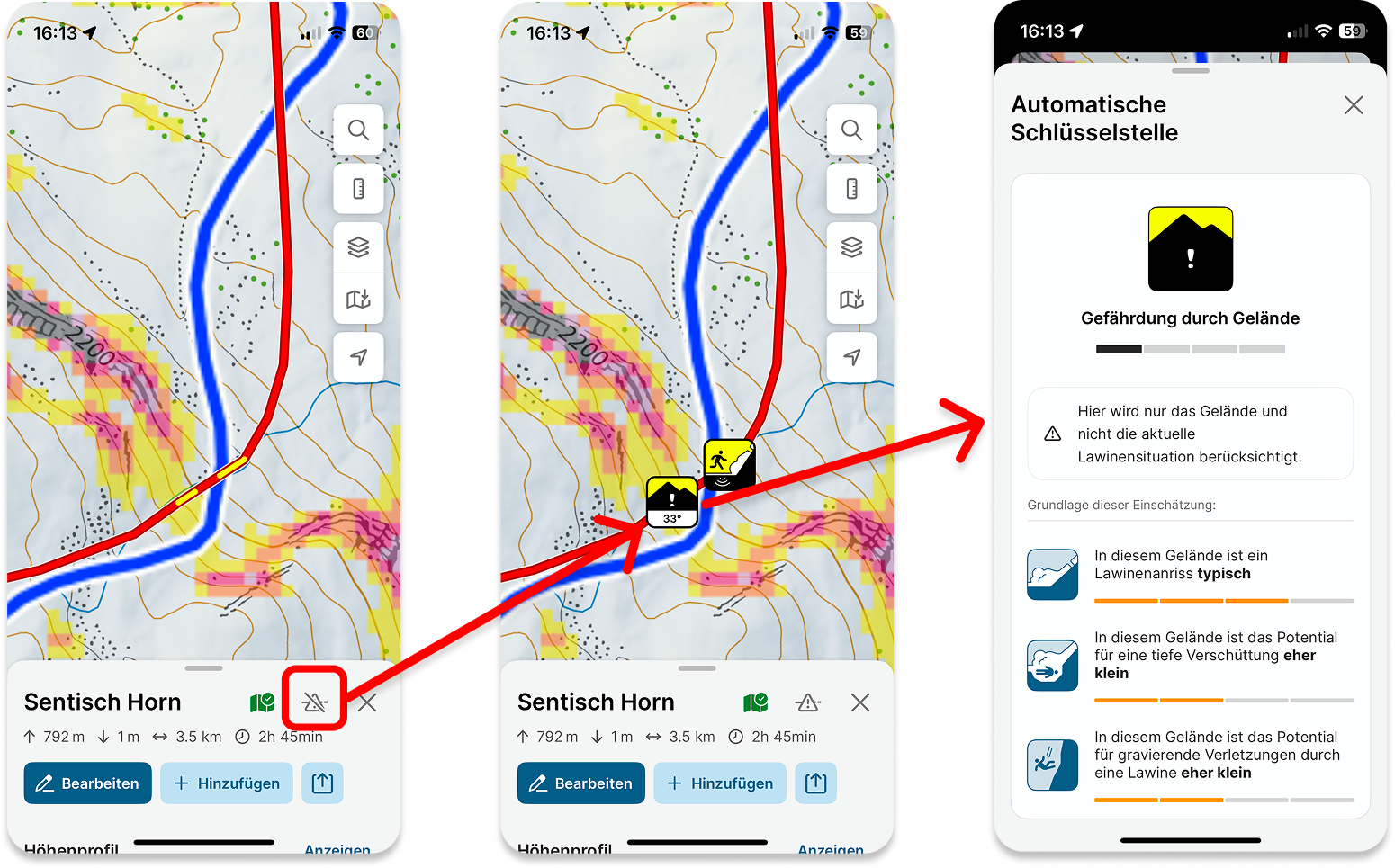 Automatische Schlüsselstellen werden für alle Routen automatisch berechnet. Sie werden als gelbe Linien in deiner Route markiert und zusätzlich durch Symbole erläutert. Diese Symbole kannst du wie folgt ein- oder ausblenden, damit die Karte besser lesbar ist.